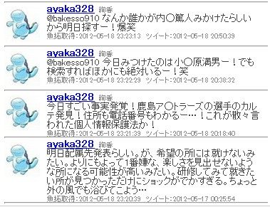 ayaka328小山記念病院の職員が鹿島アントラーズの選手の個人情報をツイッターで流出 バカッター】小山記念病院の職員が鹿島アントラーズの選手の個人情報をツイッターで流出させていると話題になっている。今日すごい事実発覚!鹿島ア◯トラーズの選手のカルテ発見!住所も電話番号もわかるー…!これが散々言われた個人情報保護法か!From: ayaka328: at: 2012/05/18 20:18:40 Re RT 公式RT今日みつけたのは小◯原満男ー!でも検索すればほかにも絶対いるー!笑From: ayaka328: at: 2012/05/18 20:38:32 Re RT 公式RTなんか誰かが内◯篤人みかけたらしいから明日探すー!爆笑From: ayaka328: at: 2012/05/18 20:50:39 Re RT 公式RT↓絢香@ayaka328無事HIM合格し鹿嶋の病院で家賃を稼ぐために働いてますー。楽しいことだいすき!https://twitter.com/#/ayaka328http://twittaku.info/usertweet.php?usr=ayaka328(ついったく)【3:はくちょう座X-1(愛知県):2012/05/18(金) 22:13:27.34 ID:XKk0VgOV0 [1/8]またツイッター女か7:金星(神奈川県):2012/05/18(金) 22:14:41.68 ID:0qN3vm430 [1/2]選手の個人情報は洒落にならないな10:ヘール・ボップ彗星(大阪府):2012/05/18(金) 22:15:45.36 ID:32eBCLIh0 [1/3]診療情報管理士試験に合格した奴がこんなこと書いちゃうのかよ14:ミザール(山口県):2012/05/18(金) 22:16:12.02 ID:gHZQCSmt0これはダメだわ29:フォボス(dion軍):2012/05/18(金) 22:19:51.96 ID:eK9WotbN0 [1/4]これは普通にクビありうる馬鹿だな・・・35:イオ(西日本):2012/05/18(金) 22:22:15.96 ID:/f5kp8gX0ほんと馬鹿発見器だな36:ポルックス(北海道):2012/05/18(金) 22:22:16.72 ID:8OV0+whz0 [1/2]こういうこと書くと問題になるって分からないのかね?せっかく就職しても研修終わったらサヨナラになっちゃうよ37:ヘール・ボップ彗星(大阪府):2012/05/18(金) 22:22:21.81 ID:32eBCLIh0 [2/3]個人情報で遊ぶ職員が居る病院とか嫌すぎる42:プレセペ星団(千葉県):2012/05/18(金) 22:24:05.62 ID:Vf4joj4E0 [2/3]この病院は患者のカルテを自由に閲覧できるんですね51:ヒアデス星団(家):2012/05/18(金) 22:26:13.13 ID:F4Q2lmum0 [1/2]なんでこういうことを迂闊にネットで書いちまうかな…59:ニート彗星(やわらか銀行):2012/05/18(金) 22:27:17.77 ID:wLu/Jnmk0 [1/3]ちゃんと個人情報保護方針を謳っているのになhttp://koyama-mh.or.jp/privacy_policy.htm【個人情報保護方針】2.個人情報の安全対策個人情報への不正アクセス、個人情報の紛失、破壊、改ざん及び漏洩等に関する万全の予防措置を講じます。万一の問題発生時には速やかに是正対策を実施します。■■■【送料無料】もし江姫がツイッターをはじめたら PR